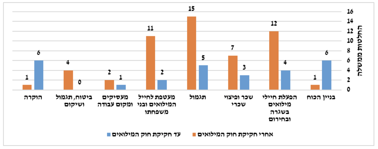 לאחר חקיקת חוק המילואים ניכר גידול במספר החלטות הממשלה ושינוי במאפייניהן: רוב ההחלטות עסקו בתחומים הנוגעים לתגמול הפרט, כגון פיצוי שכרי ומעטפת לחיילי מילואים, והסתמנה ירידה בעיסוק בהיבטים של בניין הכוח. נראה כי זהו הצורך המרכזי של חיילי המילואים שנותר טעון טיפול לאחר חקיקת החוק. ההסבר להבדלים אלה נעוץ בהבדל בין חקיקה להחלטות ממשלה: חקיקה היא תהליך ארוך ומסורבל, סיכוייו להיכשל גדולים, הוא תלוי בגורמים רבים וקשה להביא אותו לכדי השלמה. החלטות ממשלה הן ערוץ פעולה קל, נוח ומהיר יותר. חברי הקואליציה מנהלים את תהליך קבלת החלטות הממשלה, ובסופו מציגים בישיבת ממשלה הצעת מחליטים מטעם שר הביטחון. הליך זה מקל את קידום ההחלטה ביתר משרדי הממשלה. חוק המילואים מעודד גיבוש כיווני פעולה לטובת משרתי המילואים באופן הזה. לעומת זאת, החלטות ממשלה אינן מאפשרות קידום מענים מערכתיים ומקיפים יותר הכוללים תקציב ועל כן על אף היותן אמצעי נוח, החלטות ממשלה אינן יעילות כמו חקיקה והשפעתן מוגבלת.