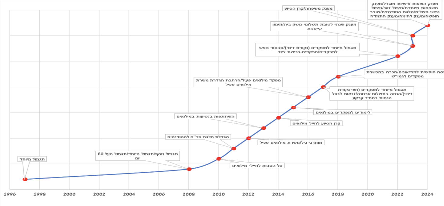 תהליך התפתחות מעטפת התמיכה והתגמולים במשך שנים, כפי שמופיע בתרשים 2, משקף את היעדר התכנון ואת טיבם התגובתי של המענים, בעיקר בתקופות של מלחמה, כמו לאחר מלחמת לבנון השנייה (הכנסת "התגמול הנוסף" כתגמול חדש במסגרת חוק המילואים, התשמ"ח–2008). אפשר להתרשם בו גם מהיקף המענקים שאישרה ממשלת ישראל במלחמת "חרבות ברזל". עם השנים הסתמנה התווספות של תגמולים כמו תגמול למפקדים במילואים או מעטפת לבני ובנות זוג. תהליך זה היה צפוי שכן המחוקקים, כאמור, השאירו פתח לקידום הטבות למשרתי המילואים באמצעות ועדה ייעודית. יתרה מזאת, לנוכח ההתמקדות בקידום החלטות ממשלה, הכרוכות בתהליך מהיר יותר, המענים מבוססים בעיקר על תגמולים כספיים ולא מספקים מענים מערכתיים, שכן אלה מצריכים תהליכי חקיקה מורכבים וממושכים וכרוכים בקשיים חוקתיים הנוגעים לשוויון הזדמנויות ולשוויון זכויות.